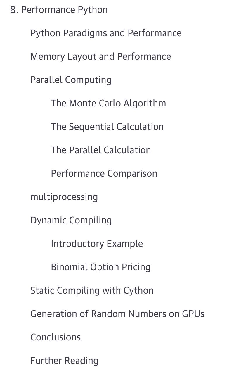 My personal favorite chapter of the book is Chapter 8: Performance Python, honestly, just look at what's in this one 🤤