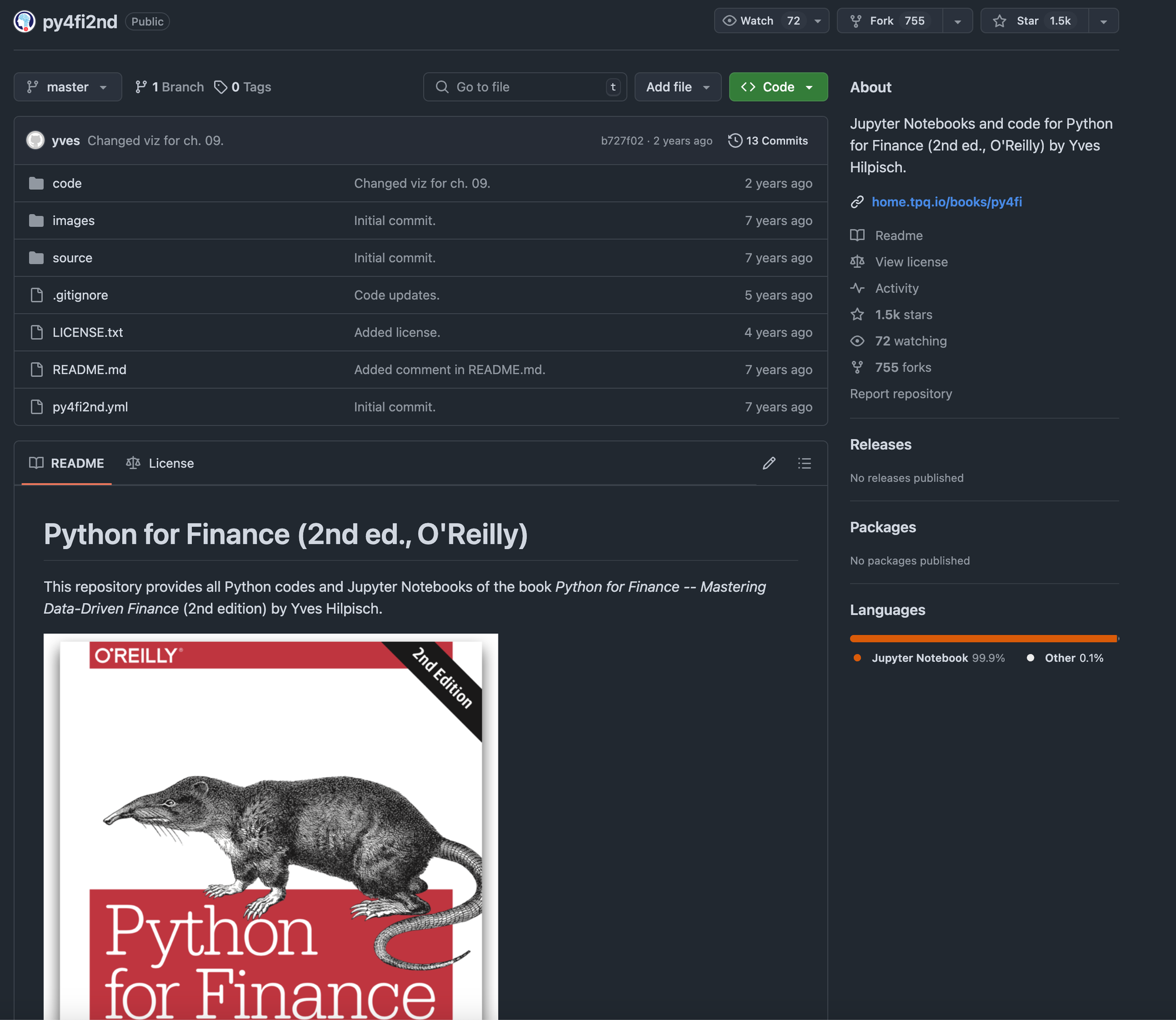 Right now using Python for Finance is one of the hottest use-cases for Python and an area where the language really shines. And you don't have to read the whole book to dive in and start trying examples because all of the code from the book is actually available on Github.